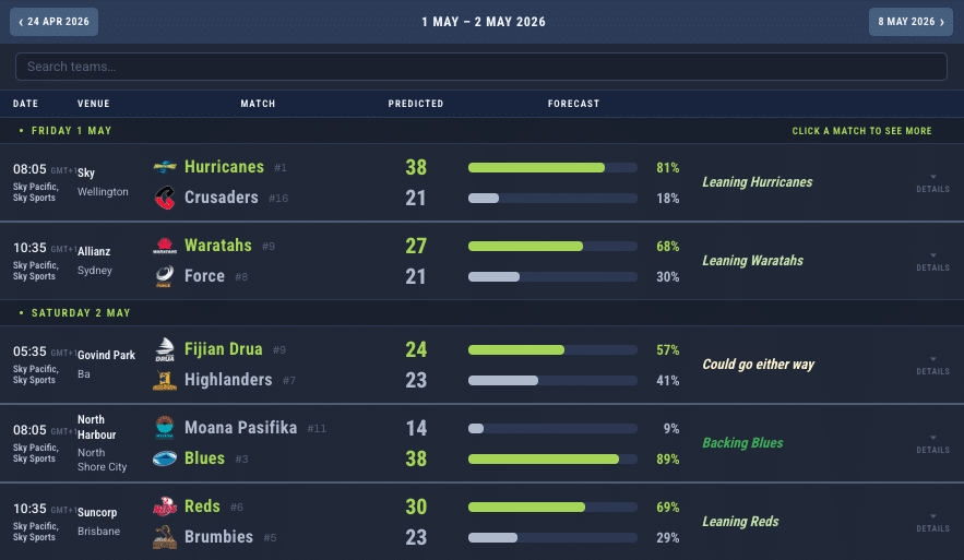 Here are the match predictions courtesy of Rugby4Cast’s predictor algorithm…