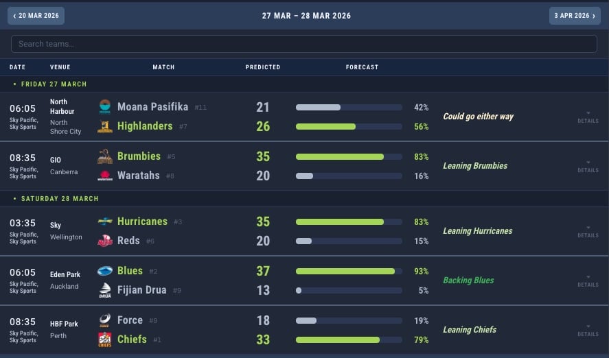 A reminder that next week Brumbies, Blues, Highlanders, Hurricanes and Moana are ALL on a bye. Make sure you consider this as you make your selections this week (apart from on the official game where you can completely change your side each week).